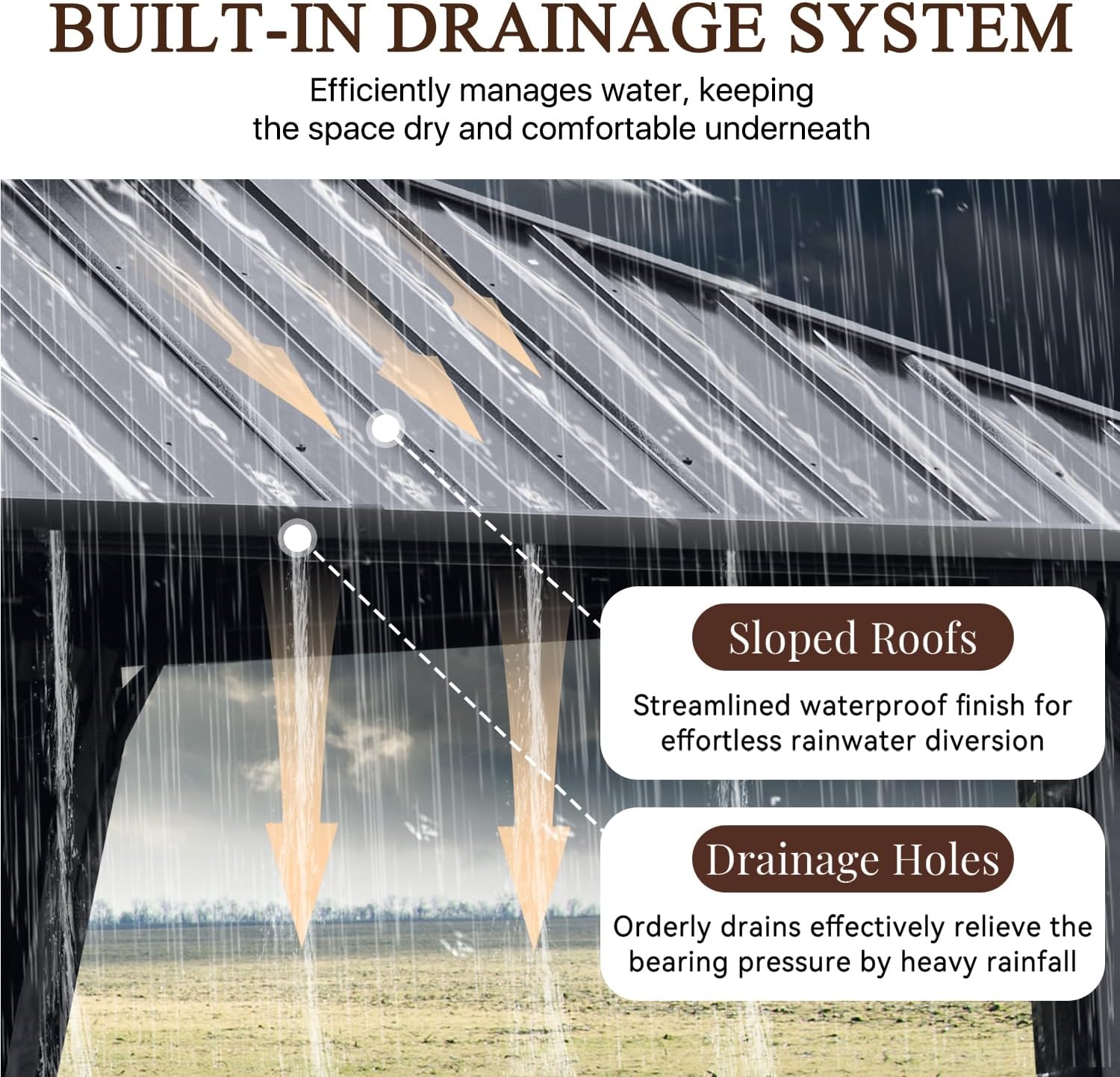 - Improved version: Drainage System Design: The roof is pitched at a reasonable angle to facilitate quick water drainage. In addition, the gutter system ensures that rainwater cascades away from the frame and poles and flows out the edges.